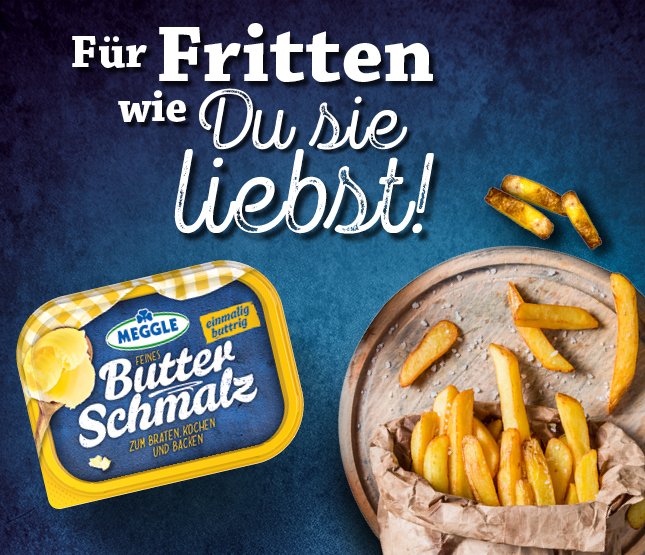 Ob zum spritzfreien, scharfen Braten, zum vollmundigen Kochen und Backen oder zum Frittieren - unser Allround-Talent darf in keiner Küche fehlen. Die einmalig buttrige Rezeptur unserer Butterexperten verleiht hierbei jedem Gericht ein besonders intensives und unverkennbares Aroma. So zaubern nicht nur Liebhaber traditionelle Rezepte sondern auch experimentierfreudige Hobbyköche im Handumdrehen Gerichte zum „Dahinschmalzen“.