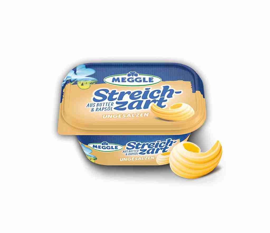 Wie der Name bereits sagt, begeistert MEGGLE Streichzart einerseits mit der perfekten Streichfähigkeit direkt aus dem Kühlschrank und andererseits mit vollem Buttergeschmack. Für höchsten Genuss sorgen die sorgfältig ausgewählten Zutaten: Butter und hochwertiges Rapsöl. Insgesamt werden vier Liter frische Milch zu je 250 g der Genusskomposition verarbeitet. Ob als Brotaufstrich, zum Backen, Kochen oder Braten – die MEGGLE Streichzart ist jederzeit streichbereit.